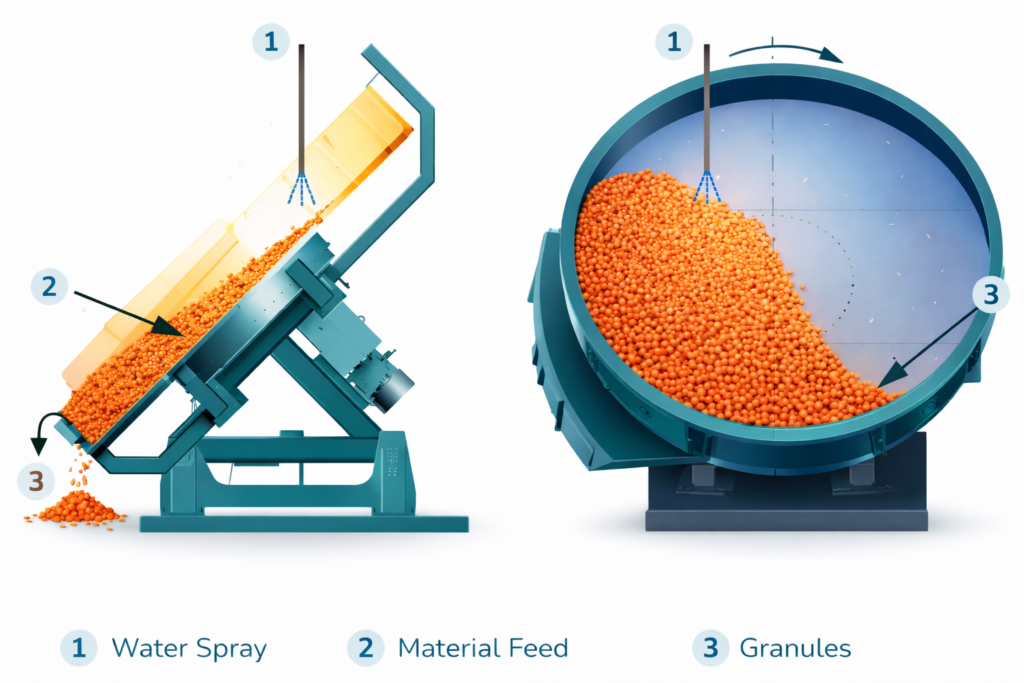 Dönerek yuvarlama ve granüzasyon yapan granülatörlerde eğim açısı ve dtambur dönme hızı ile tanecik boyutu ve kapasite değiştirilebilir.